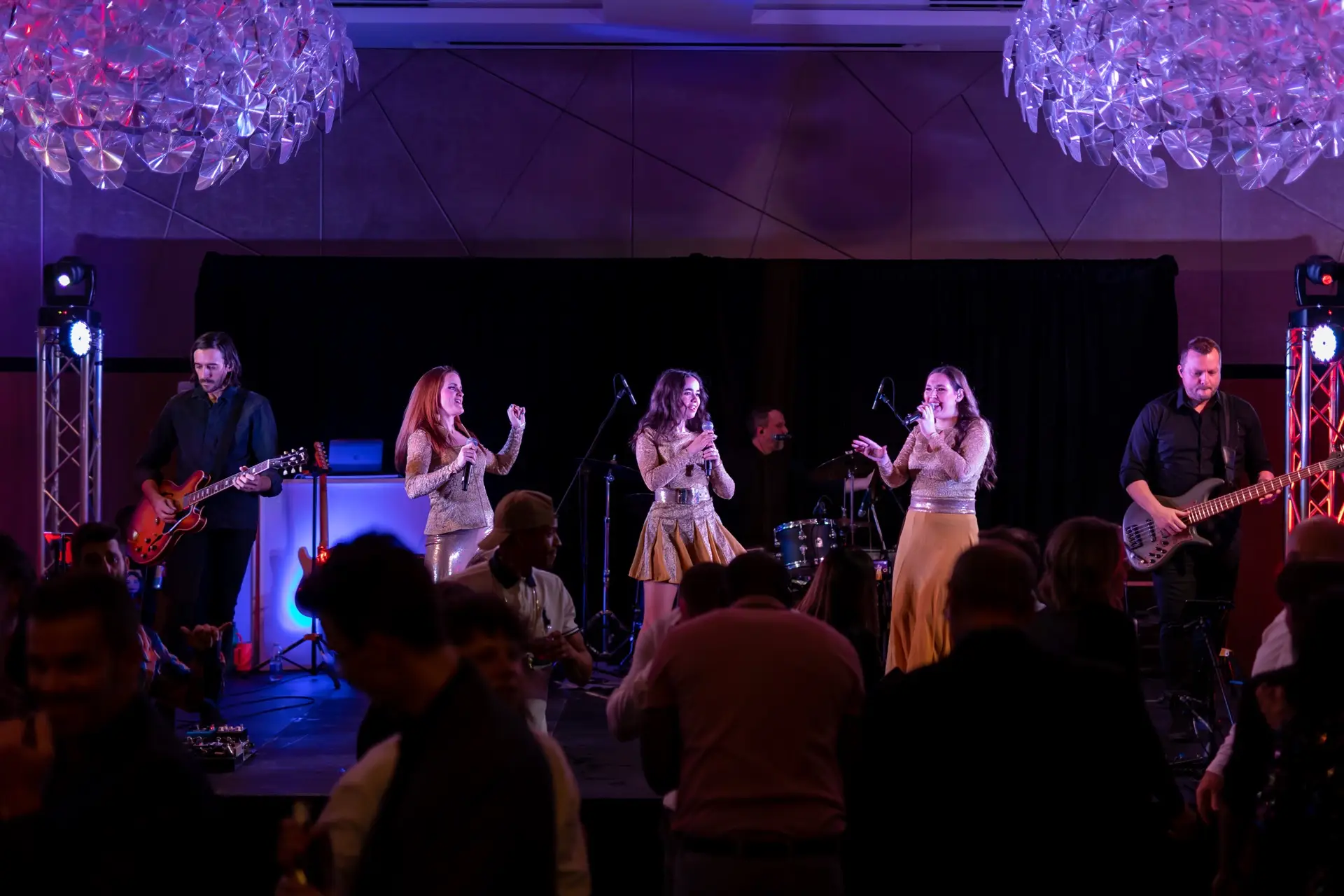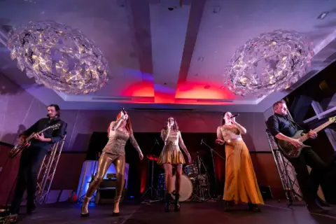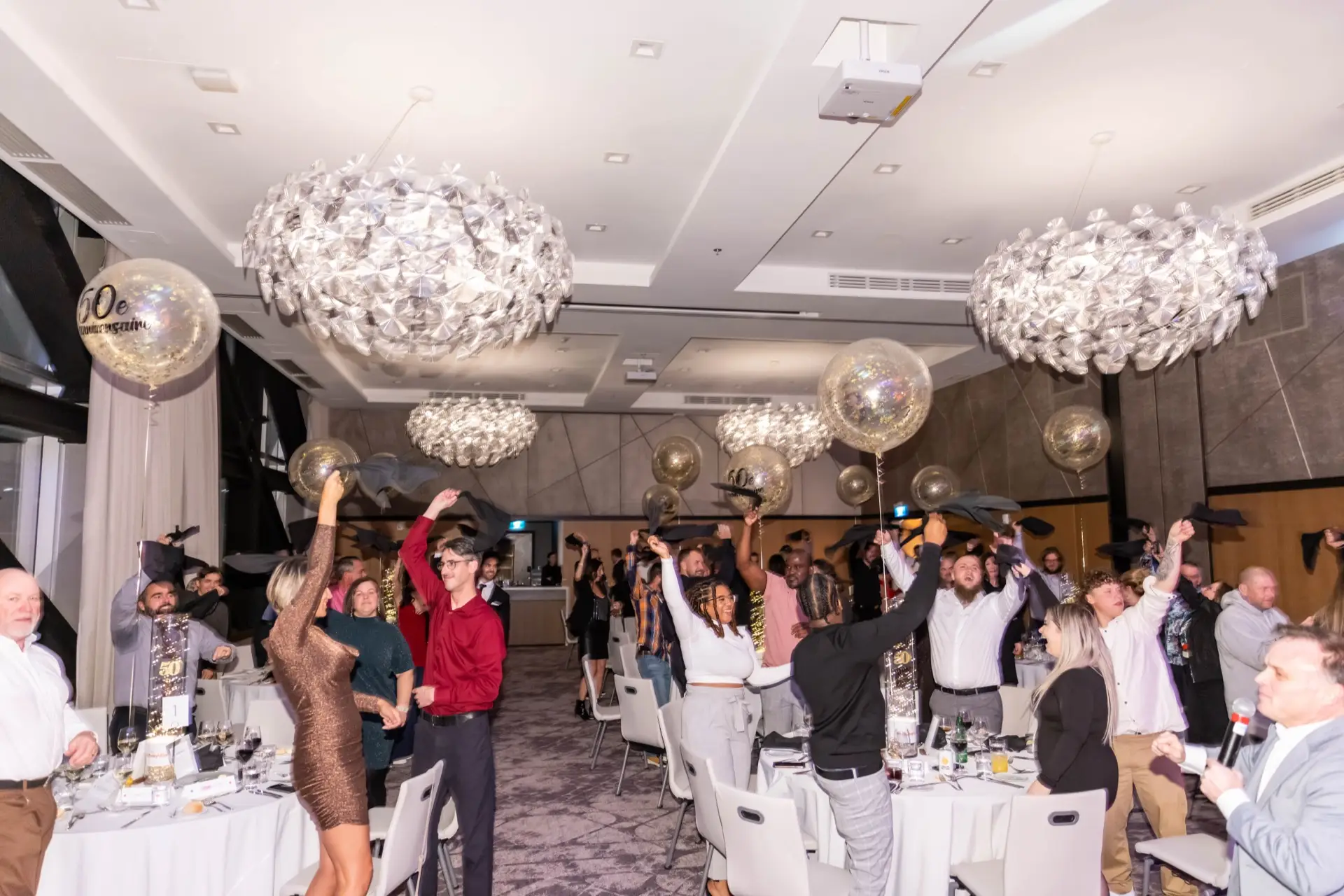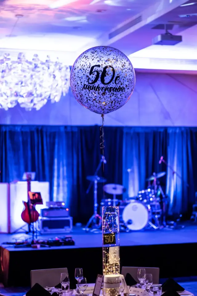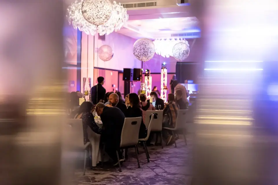 Le lieu, décoré avec élégance dans des tons festifs d’or et de blanc, offrait aux invités une atmosphère conviviale. Des ballons imposants, des centres de table éclairés et une scène accueillant le groupe Bond Girls ont transformé l’environnement. L’excellent repas servi par l’équipe de l’hôtel Humanity a également contribué à rehausser cet événement.