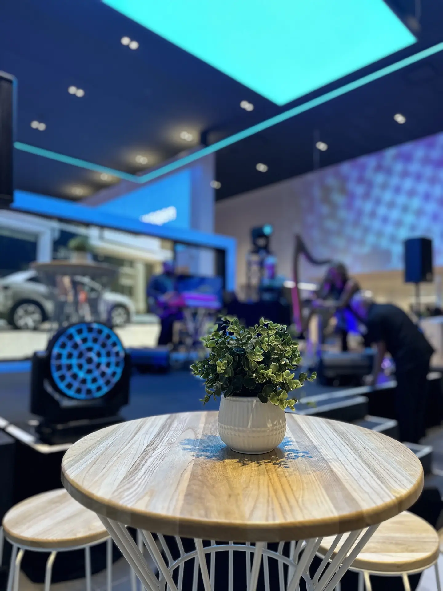 La salle de démonstration s’est transformée en un véritable espace prestige, aménagé avec des tables cocktails, tabourets design, un tapis rouge et des bars élégants, créant une atmosphère chic et sophistiquée. Chaque élément du décor a été minutieusement pensé pour maximiser l’impact visuel et offrir un cadre enchanteur.